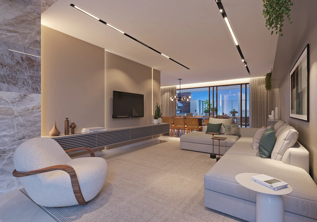 Sala integrada, 3 quartos sendo 1 suíte, varanda gourmet. Planta inteligente com 96 m² de puro conforto.