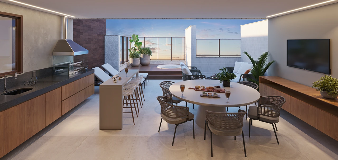 Varanda ampliada com churrasqueira a carvão e ofurô privativos. Penthouse 3 Suítes com 207 a 210 m² de sofisticação.